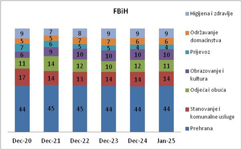 - U Federaciji BiH na prehranu otpadalo je oko 44% potrošačke korpe tokom petogodišnjeg perioda.