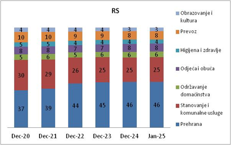 - U Republici Srpskoj građani su na prehranu izdvajali od 37% ukupnih troškova u decembru 2020. do rekordnih 46% u decembru 2024.