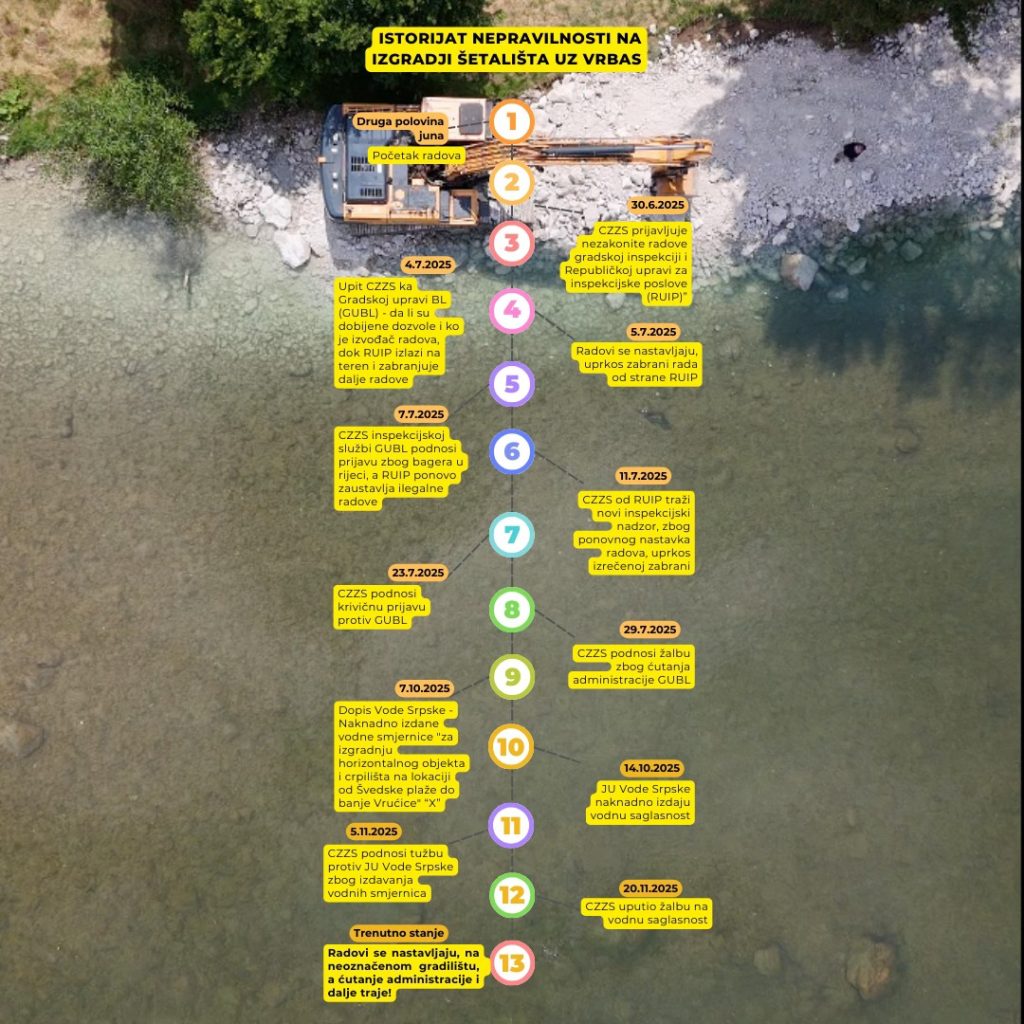 Radovi na izgradnji nove dionice šetališta uz Vrbas kod plaže Vrućica i nizvodno , dakle na desnoj obali , započeti su u junu 2025. Centar za životnu sredinu (CZŽS) je odmah reagovao ističući da su radovi počeli bez pribavljenih zakonski obaveznih dozvola. CZŽS tvrdi da radovi uključuju “smanjivanje i betoniranje korita rijeke Vrbas”, te da se intervencija odvija u samom koritu rijeke, ne samo na obali i da postoje osnovane sumnje za niz nezakonitosti , zbog čega su podnijeli i krivične prijave. Ovo je povod za razgovor sa Igorom Kalabom iz CZŽS .
